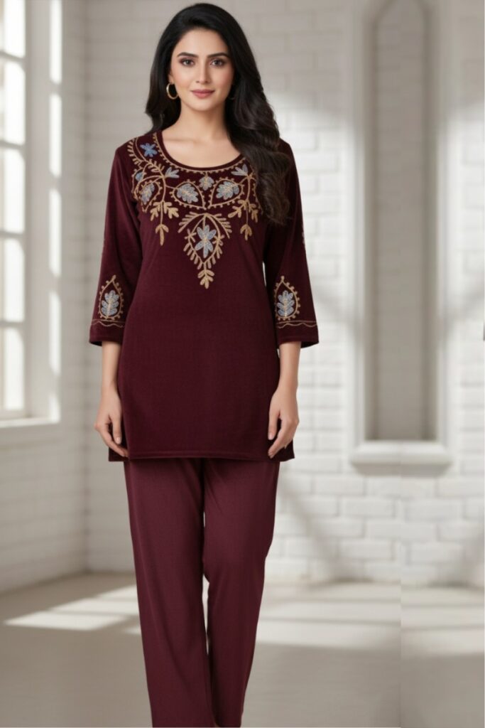 Rich in tone and texture, this maroon velvet co-ord set is designed to bring warmth and elegance to your festive wardrobe. The soft velvet base is adorned with beautiful threadwork in golden and blue hues, adding a touch of color and artistry to the outfit. The round neckline and straight silhouette make it both stylish and comfortable, perfect for long hours of wear. Whether you’re attending a family dinner or a small festive celebration, this set delivers a refined traditional look with minimal effort.