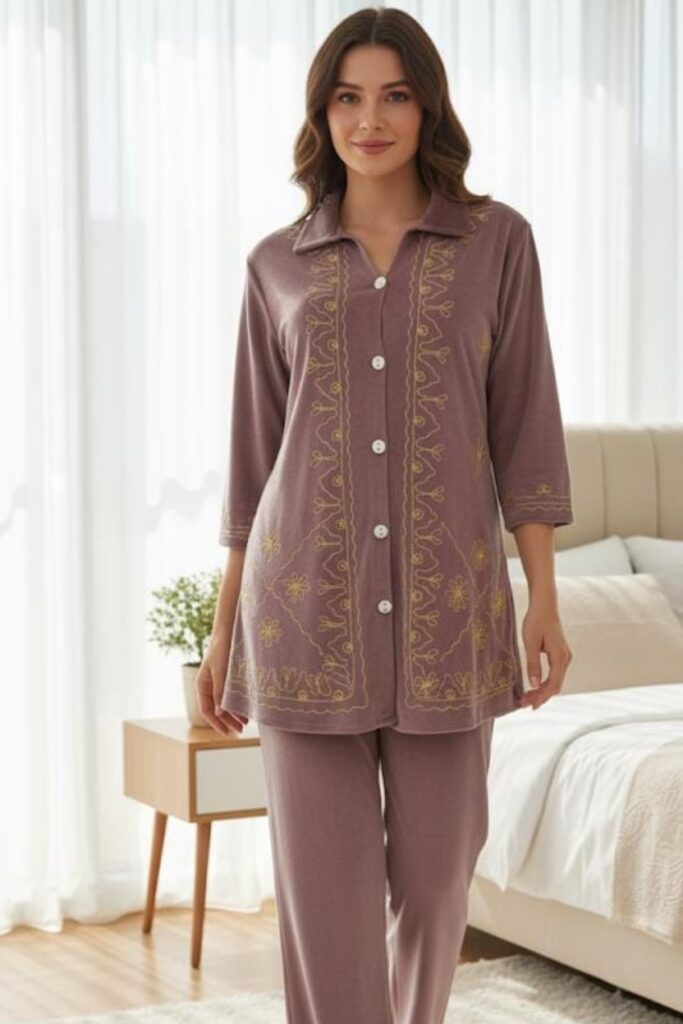 This embroidered mauve co-ord set brings together comfort and elegance in the most effortless way. The set features a soft, breathable fabric that feels gentle on the skin, making it ideal for both relaxed days at home and casual outings. The top comes with a button-down front, three-quarter sleeves, and intricate golden embroidery that adds a graceful, handcrafted touch. Paired with matching straight-fit pants, this outfit offers a relaxed yet refined silhouette that’s easy to wear and style. Perfect for women who appreciate understated sophistication with a hint of charm, this co-ord set is a timeless addition to your everyday wardrobe.