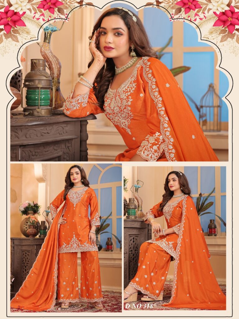 This Bright Orange Suit with Plazo is designed to make you stand out with its rich color and beautifully crafted embroidery. The top features premium thread and zari work that highlights the neckline and hemline. Paired with flared embroidered plazo pants, this outfit becomes the perfect balance between stylish and traditional. The embroidered dupatta adds a touch of regal charm, making it ideal for festive occasions, haldi functions, family gatherings, and celebrations. A must-have for women looking for elegant ethnic pant sets with dupatta and stylish festive wear.